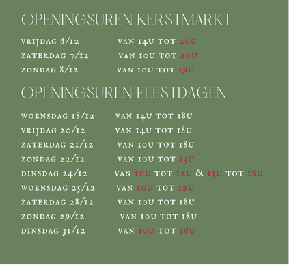 Bekijk onze kalender voor de openingsuren op de afhaaldata. Deze kunnen afwijken van onze gebruikelijke openingsuren.